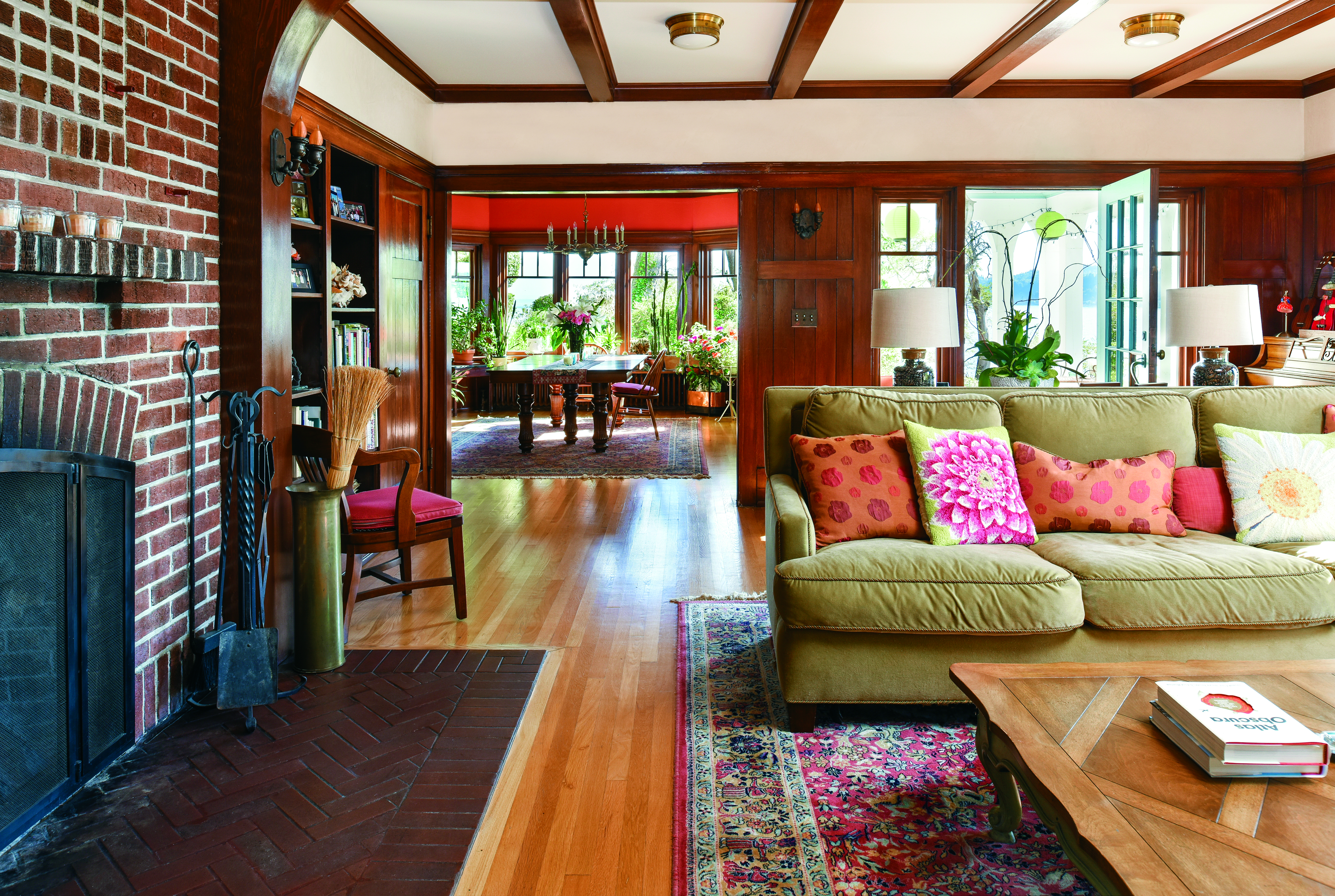 The residence sits on one of the most recognizable locations on Wing Point on Bainbridge Island. This home and waterfront property is visible from the ferry as you enter Eagle Harbor ferry dock. The house was originally clad in cedar shingles in a neoclassic design. Original quarter sawn-oak paneling and detailing remain throughout today. Built-in benches and paneled walls are also present. The Arts and Crafts fireplace has original tiles. A sunporch that was originally open was enclosed at some point. The exterior has multiple pitched rooflines, dormers and a dormered eating area off the kitchen. The original staircase handrails and built-in bookcases are still intact. A porch overlooking the harbor allows close up views of ferries as they enter and leave the harbor.